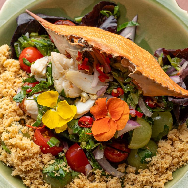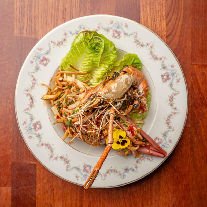 A salad that hits every note with grilled river prawn, crunchy banana blossom, fried aromatics, and signature dressing.