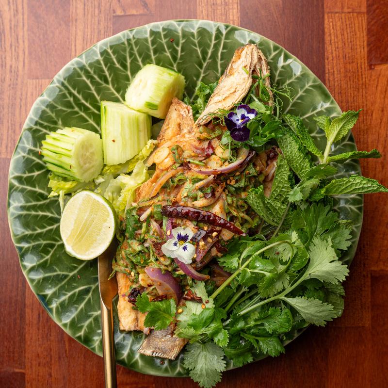 Thai mackerel mixed with aromatic Thai herbs, lemongrass, shallots, mints, kaffir lime leaves.
