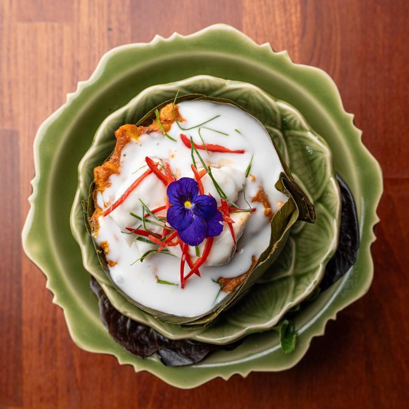 Thai mackerel cooked in red curry sauce, topped with coconut cream.