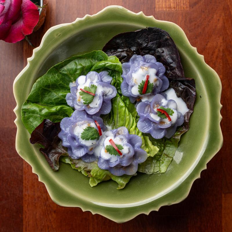 Royal flower dumplings. Tender rice-based dough is naturally dyed, with a sweet-savory chicken and peanut filling.