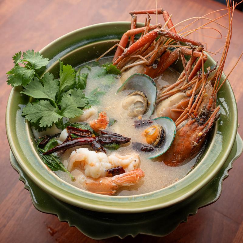 Thai-styled spicy bouillabaisse. Mixed seafood in spicy, clear broth with Thai herb, lemongrass, kaffir lime leaves, chili, lime juice, and culantro.